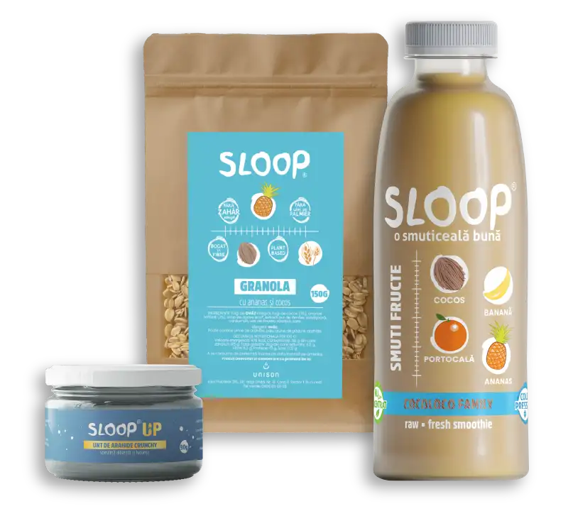 Ce este un smuti SLooP ? O gustare delicioasă făcută dintr-un amestec din fructi proaspete întregi unele zdrobite, altele stoarse și nimic altceva! Smutiurile sunt mai sățioase deoarece conțin pulpa și fibrele Fructelor